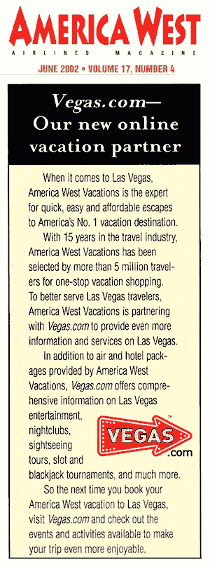 To view press release PDFs you will need to have the Adobe Acrobat Reader. You can download the reader for free from Adobe. Download the pdf: 6-2002 America West Airlines Magazine:VEGAS.com our new online vacations partner