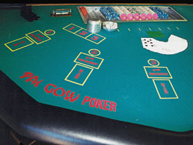 After individual wagers are placed in the circle in front of the Players, the dealer then rolls the dice to determine which Player is dealt cards first. Next, the Players are each given seven cards with which to make two separate poker hands. Five cards must be placed in the Highest Cards section, and the remaining two cards must be placed in the Low Cards section. The five-card hand always must be the highest-scoring hand. If you place the highest-scoring cards in the Low Cards section, you will lose automatically.