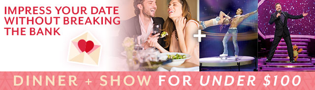Terms and Conditions: Offer applies to any currently listed performance dates. Additional blackout dates may apply. Offer applies to new bookings only. Offer has no cash value and becomes void if qualifying booking is canceled. Promotion subject to change or termination at any time, without notice. The cost of tax and gratuity are dependant on individual dinner+show packages. Offer not valid on existing reservations and may not be combined with any other offer. Subject to availability. This offer does not accumulate if unused. Some restrictions may apply. Limited seating is available for select performances. This offer is non-transferable and has no cash value. Show tickets can only be redeemed by the primary guest as it appears on the reservation. Offer does not apply to group reservations and may be cancelled or modified without notice at any time. Tickets must be picked up from the applicable Box Office.